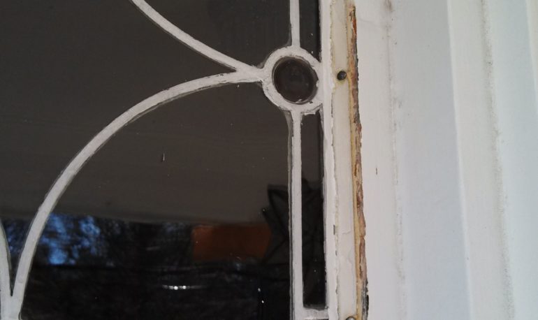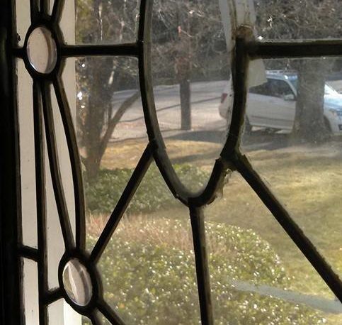 3. This window “rattled”, when struck, a clear indication that the window’s “cement” had long ago succumbed to the elements and washed away. Note the Scotch Tape holding the oval lite in place.