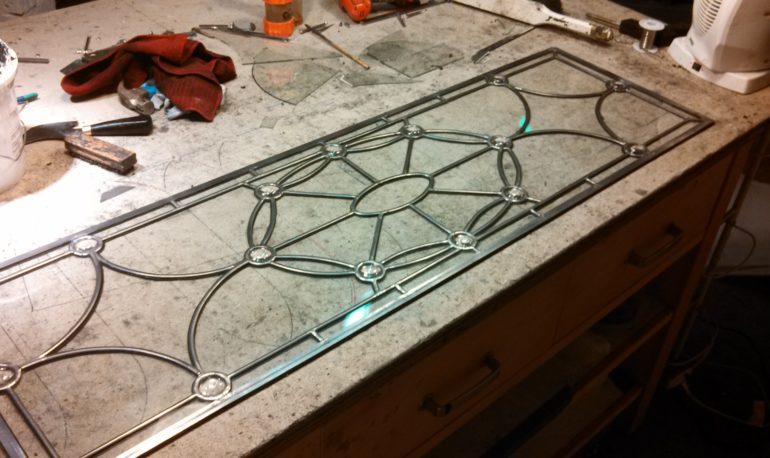 1. Close up of jeweled entryway transom.  This window had become badly bowed to the point that the most vulnerable glass lites had begun to crack under the force of the window’s own weight. The decision to paint the lead came white is puzzling and likely an esthetic choice.